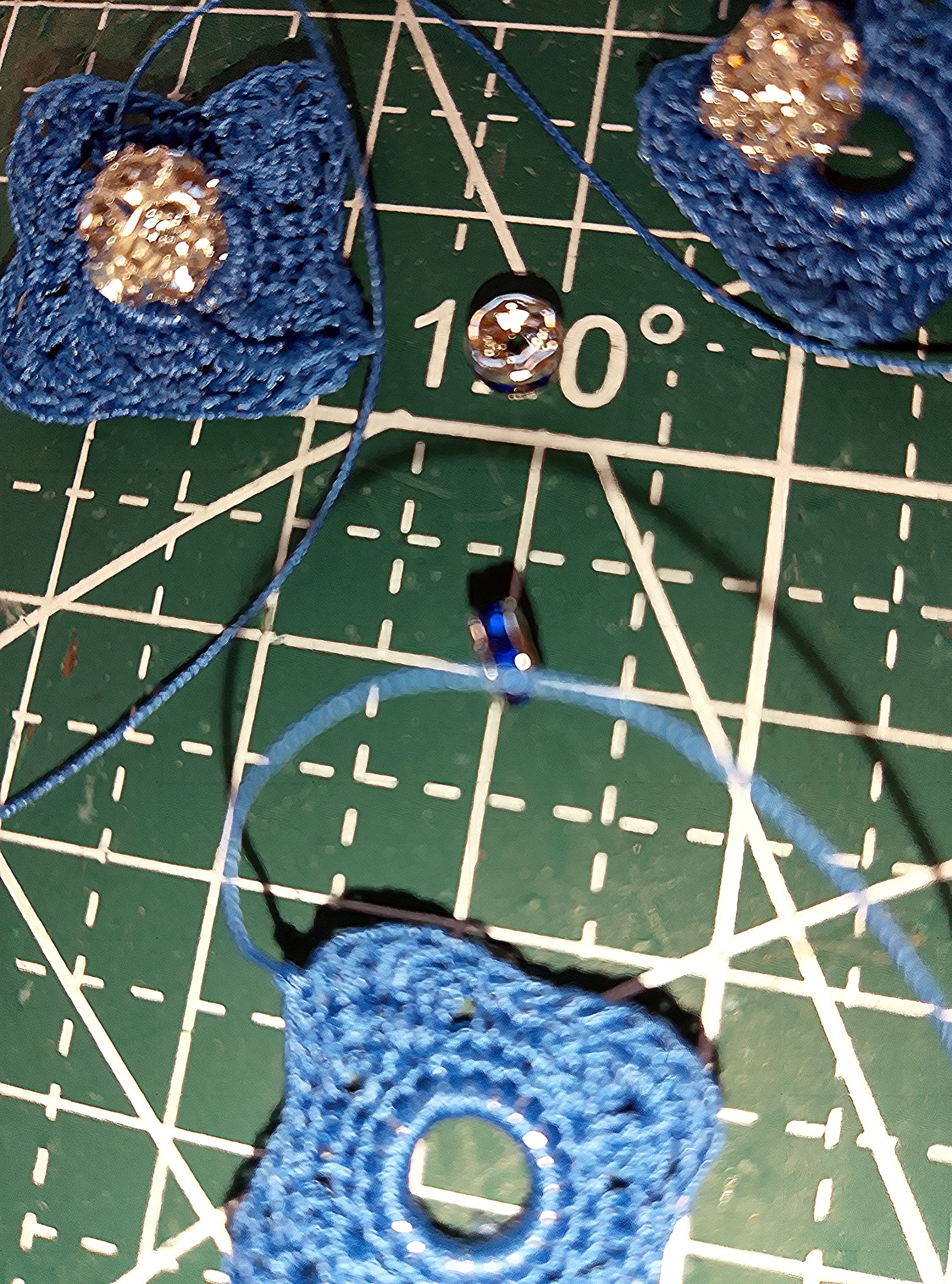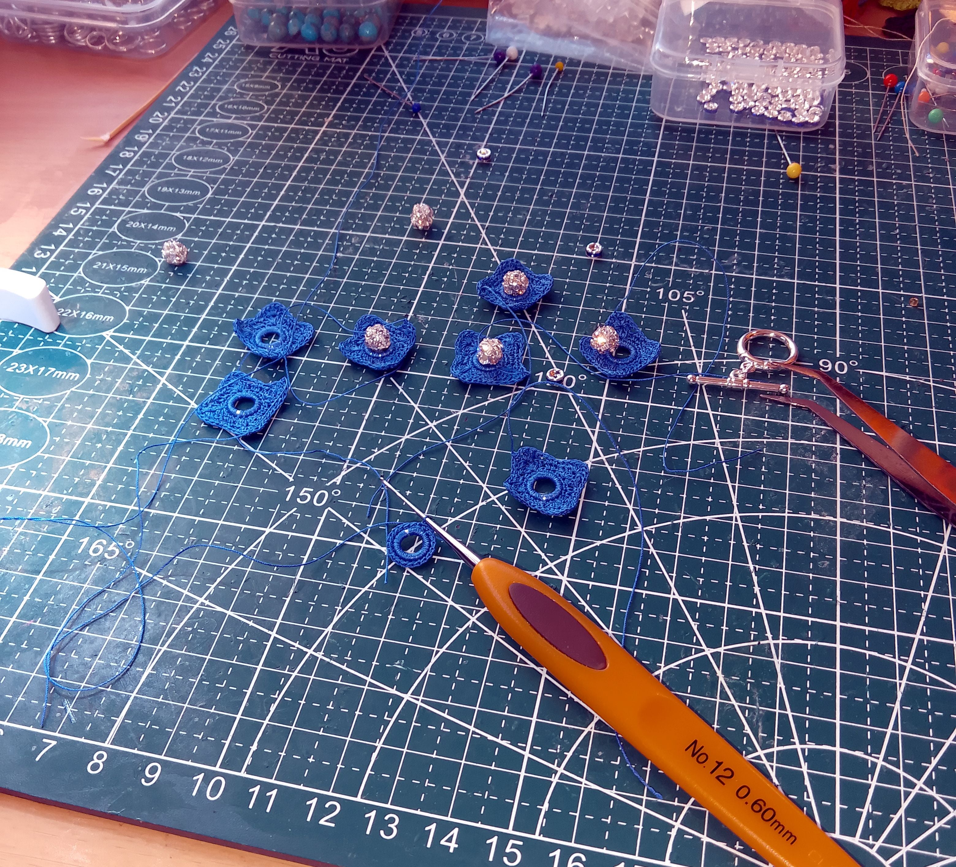 Bonjour, aujourd'hui je vous propose d'entrer dans mon processus de fabrication pour un bracelet en DMC 80 bleu roi. Tout d'abord j'ai pris des anneaux de 0,5 mm de diamètre et j'ai crocheté 20 mailles serrées dans l'anneau, puis un range de mailles serrées. Ensuite deux mailles en l'air à la place d'une bride et deux brides dans la même maille , une maille en l'air sauter une maille faire deux mailles serrées dans les deux mailles suivantes une maille en l'air sauter une maille , dans le maille suivante 3 brides une maille en l'air 3 brides, continuer le deuxième rang comme mentionné. faire un troisième rang de la même façon? terminer par une maille coulée pour fermer le rang et une maille en l'air, passer le fil, laisser du fil pour coudre les carrés ensemble. Voilà le premier carré . En faire suffisamment pour obtenir un bracelet. J'en ai fait huit.