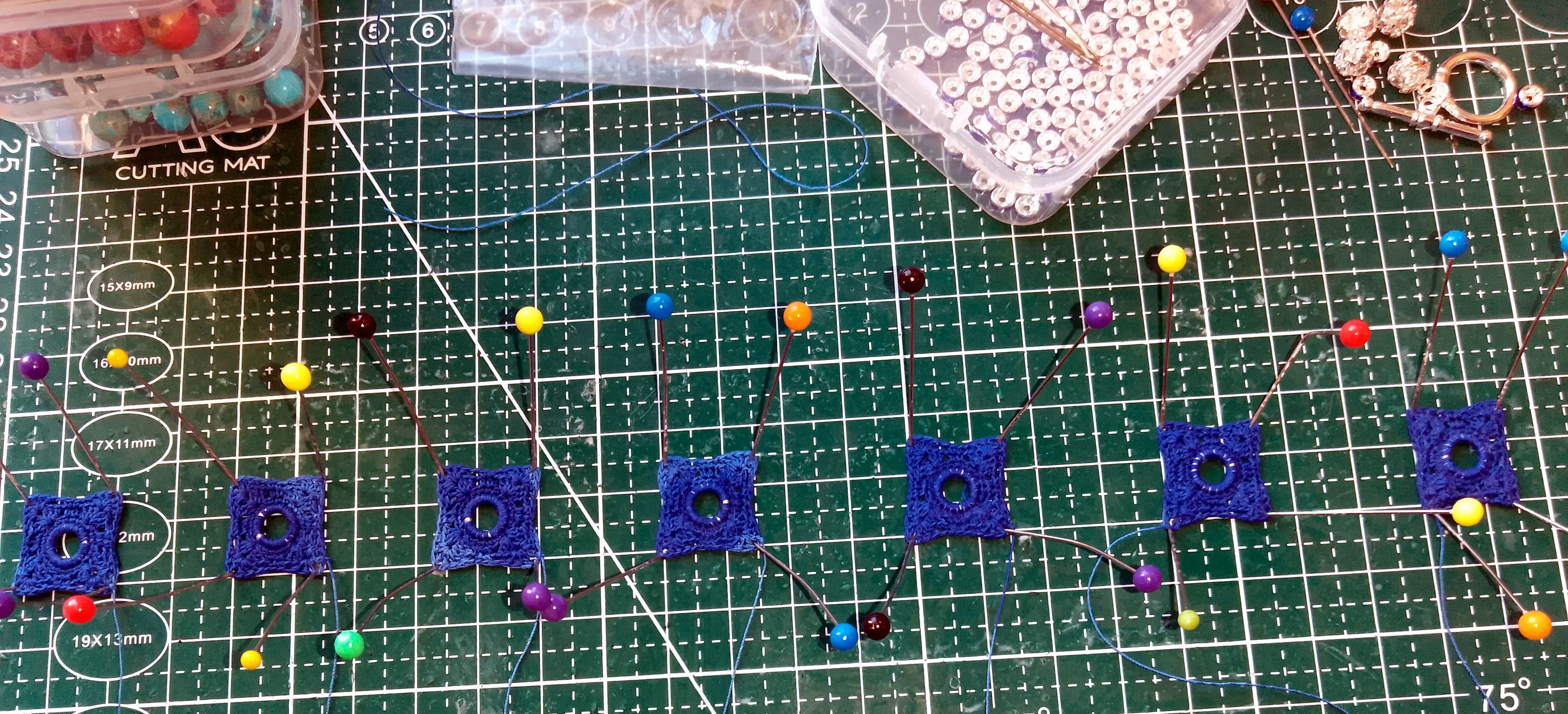 J'ai appliqué le durcisseur sur mes carrés et je les maintiens avec des épingles pour qu'ils aient tous la même taille, il faut attendre 30 minutes pour que le produit sèche, ensuite vous pourrez faire le montage du bracelet.