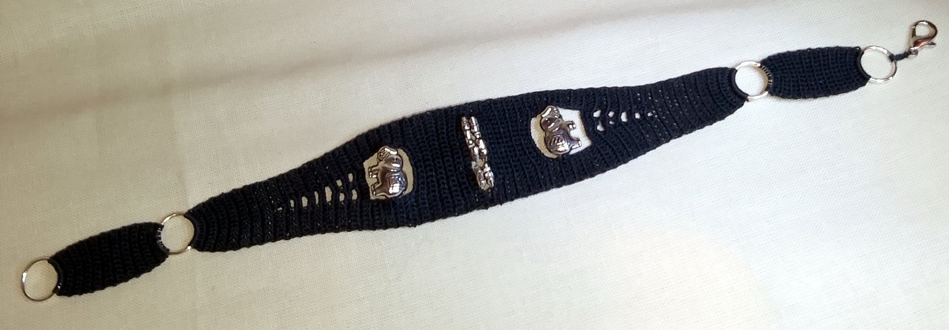 Le Bracelet noir Serge éléphants incarne l'élégance intemporelle et le savoir-faire français. Entièrement crocheté à la main avec du coton DMC 80 d'une finesse exceptionnelle (crochet 0,60), ce bracelet allie délicatesse et caractère.