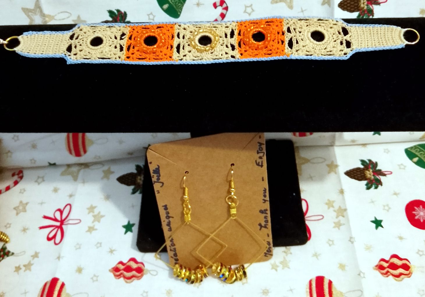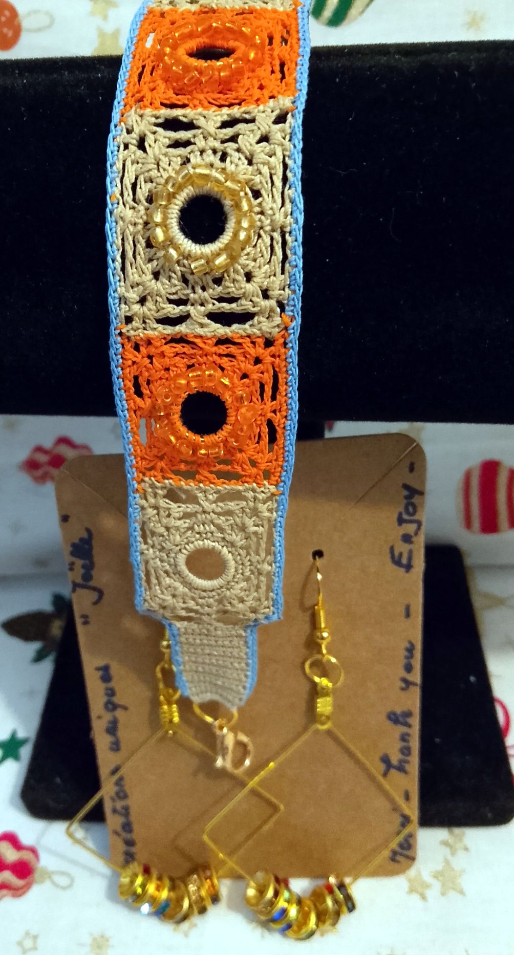 Bracelet crocheté en coton DMC 80,beige, orange, petit liseré bleu, petites perles de rocaille, boucles d'oreilles dorées avec perles en strass colorées, qualité supérieure, fait main. Facile à porter et très doux, tout un monde de fantaisie ...